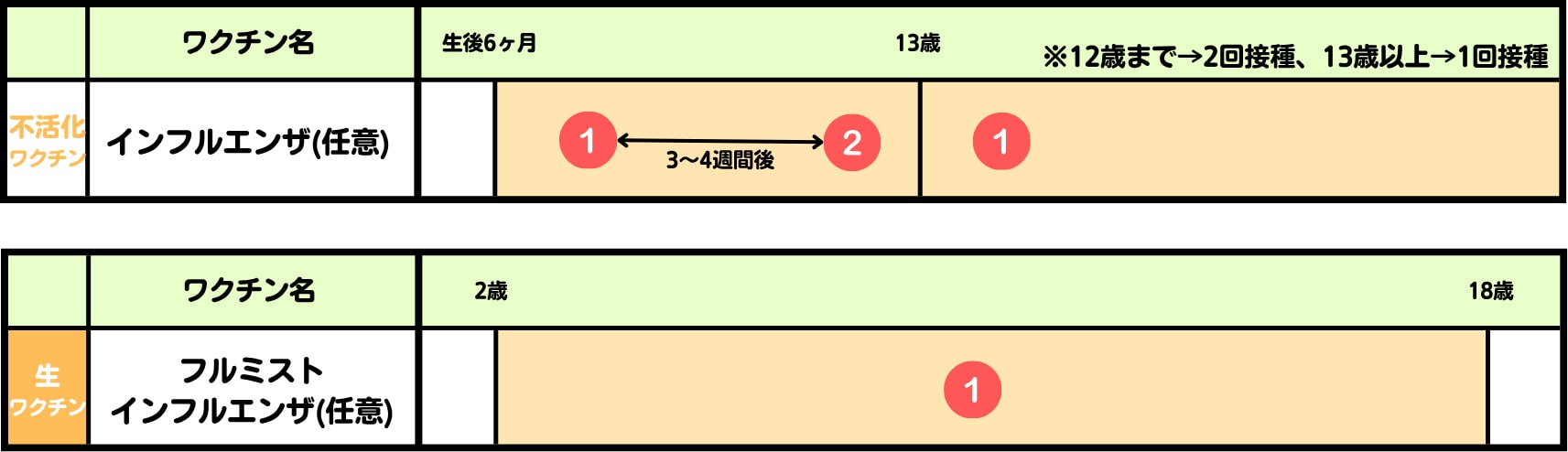 | 接種回数 | 6ヶ月〜13歳未満:2回(2〜4週間隔。効果面では4週間が望ましい)/13歳以上:通常1回(添付文書上は1〜4週間隔で2回も可) | 1シーズン1回 |
